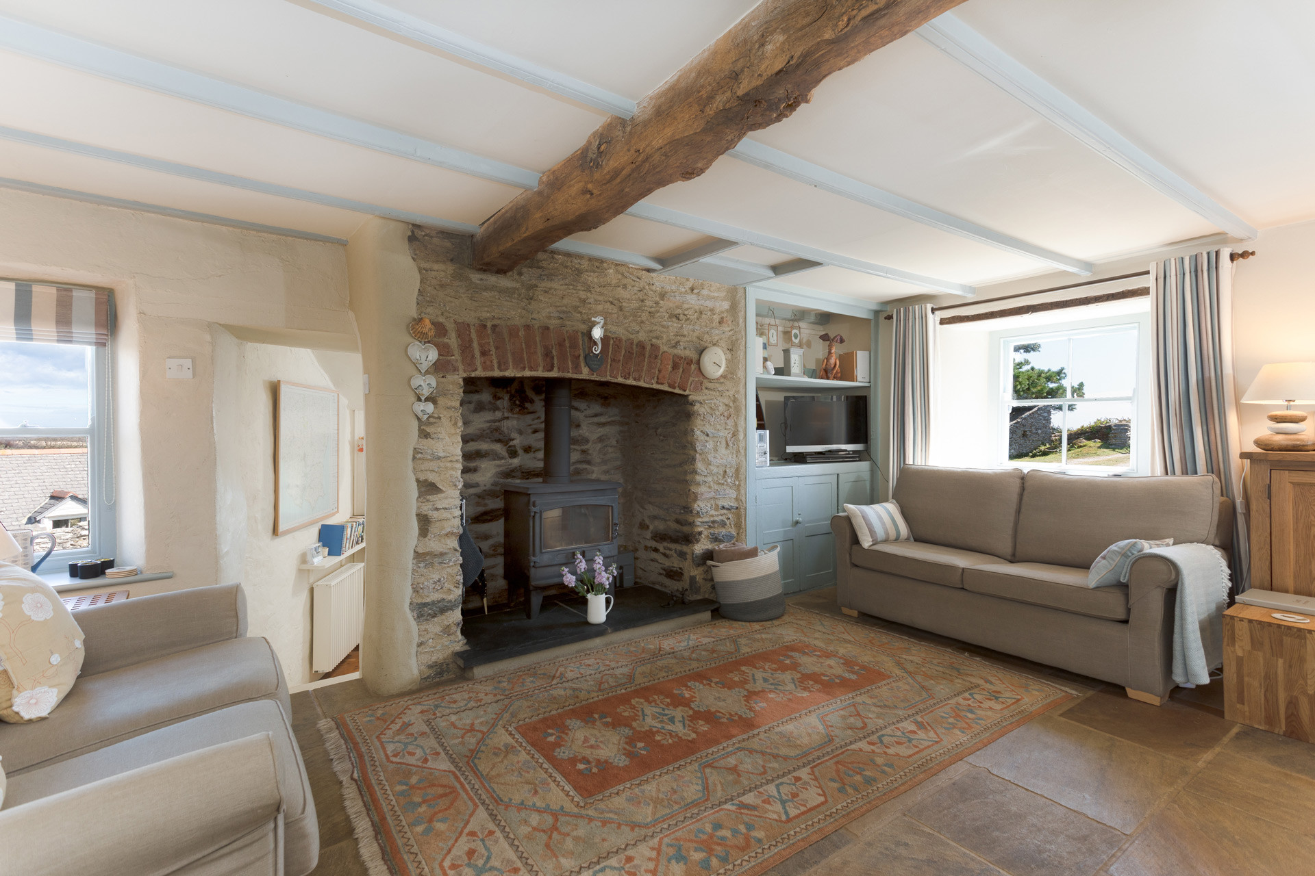 Sympathetic restoration has retained or restored original features such as the fireplace, wide wooden floorboards and sash windows. The cottage is well equipped, comfortably furnished and tastefully decorated using tranquil seaside colours and natural fabrics. Plentiful windows on three aspects ensure that Kittiwake is light and airy with excellent views over the valley to the sea. It’s cool in summer and cosy in winter, with a log burner in the sitting room and heaters in every room.